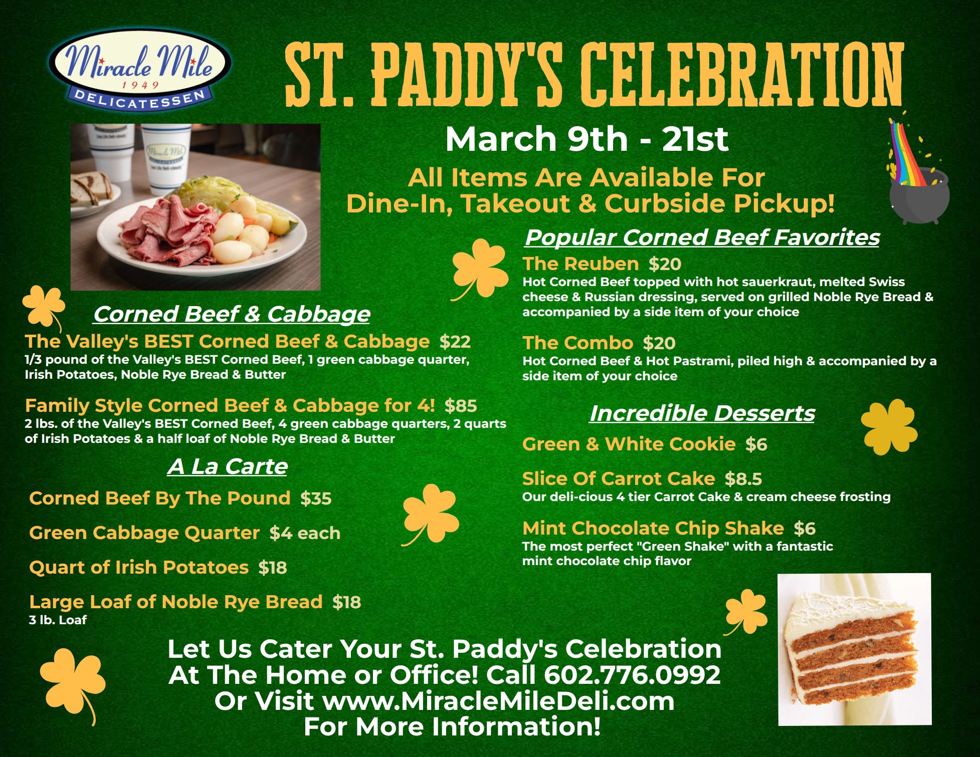 Having a St. Patrick’s Day celebration at your home or at the office? Let Miracle Mile bring the Corned Beef & Cabbage to you and let us do the work! That’s right… We can bring our awesome Corned Beef & Cabbage special to feed your crew and deliver it to your home or office for any orders over $100 for a nominal delivery fee. So be sure to think of us and let Miracle Mile do the cooking so you can have more time to enjoy this very special holiday (and drink more too)! Call us today and place your order with us over the phone by calling 602.776.0992 to reserve your delivery! Don't wait until the last minute!